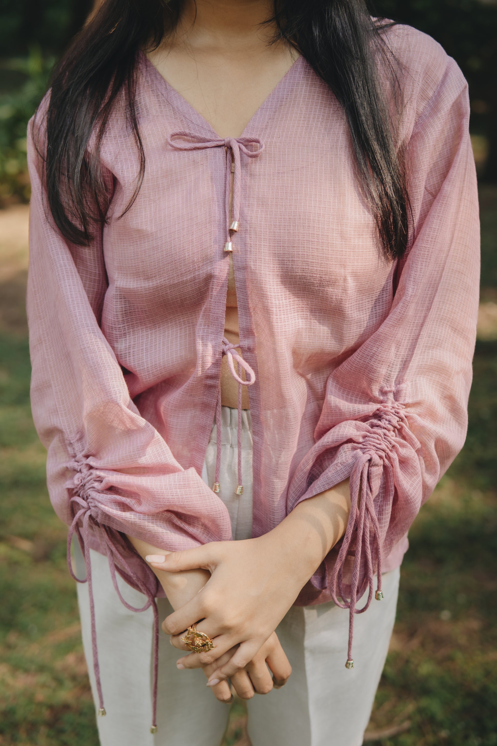 • Tunnel-drawstring sleeves with gathered effect